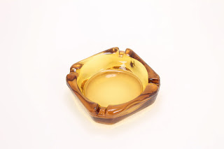 The second vignette that drifts in and out of occasional consciousness is when I came downstairs one night that same year, well past my bedtime, and busted my mom smoking a cigarette. I must have had the biggest "WTF?!" on my face (my mom didn't smoke, as far as I knew), but she never lost her cool. She looked right at me and snuffed out the cigarette in the amber-glass ashtray we kept for company. It looked like this (but, in this case, with a snuffed-out cigarette in it):